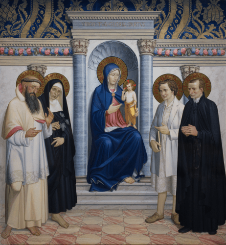 The sacra conversazione genre is meant to depict a mystical exchange — that is, a quiet-yet-intense meeting of souls rather than an exuberant dialogue of voices. The four saints all come from different places and periods of history, but are united now in eternity, in heaven, where they pray for us while contemplating the face of God.