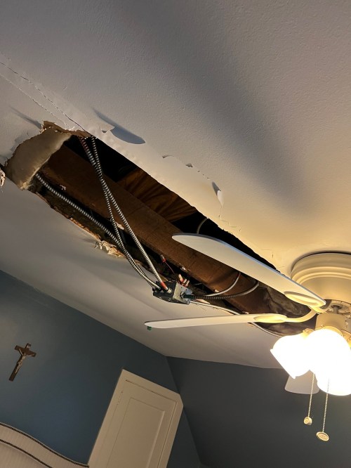 This is the collapsed ceiling in a third floor bedroom – due to persistent water intrusion and also due, in part, to the poor quality of the build-out on the third floor (one problem is that thinner-than-normal sheetrock was used). The discovery of this problem was providential: when Fr. Adams moved in, Fr. Jerabek quickly relocated to this room, in order to give Fr. Adams access to a certain suite on the second floor for his living quarters. Shortly after Fr. Jerabek started sleeping in the bed that is right under this ceiling, he woke up one night to water dripping on his legs. If he had not moved up here, the problem would have continued probably for quite a while without anyone noticing (because the mattress and bedding would have been absorbing it!), and a far worse outcome might have occurred. We were at least able to go in the area above the ceiling and put buckets up. But – the ceiling was already sagging due to the poor construction quality, and the water was the final nail in the coffin, so to speak. Not long after Fr. Jerabek moved out of this room, the ceiling collapsed! Please note: Phase 1 of the campaign does not include any provision for fixing this problem – but the photo is provided to show how extensive the damage is.