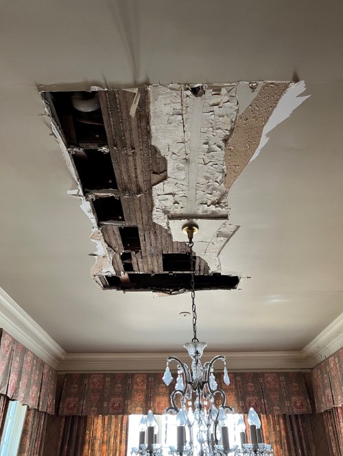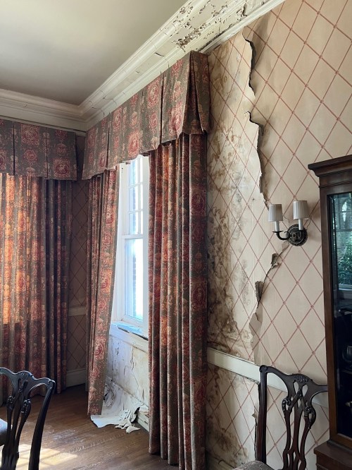 This opening in the dining room ceiling is the outcome of a major leak in the bathroom above (old plumbing). Because the exact source of the leak was not clear, and in order to be sure it had stopped, the plumber had to open the ceiling to access the pipes. Before that point, a great deal of water had come down through the chandelier and eventually through holes that the water opened in the ceiling, dripping all over the antique furniture (see below) and ruining it. The scope of Phase 1 of the Honoring Father Coyle Campaign includes patching this plaster ceiling and repairing the major plaster cracks in the dining room, but not fully remediating the wallpaper, draperies, or furniture.