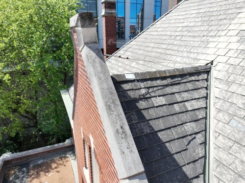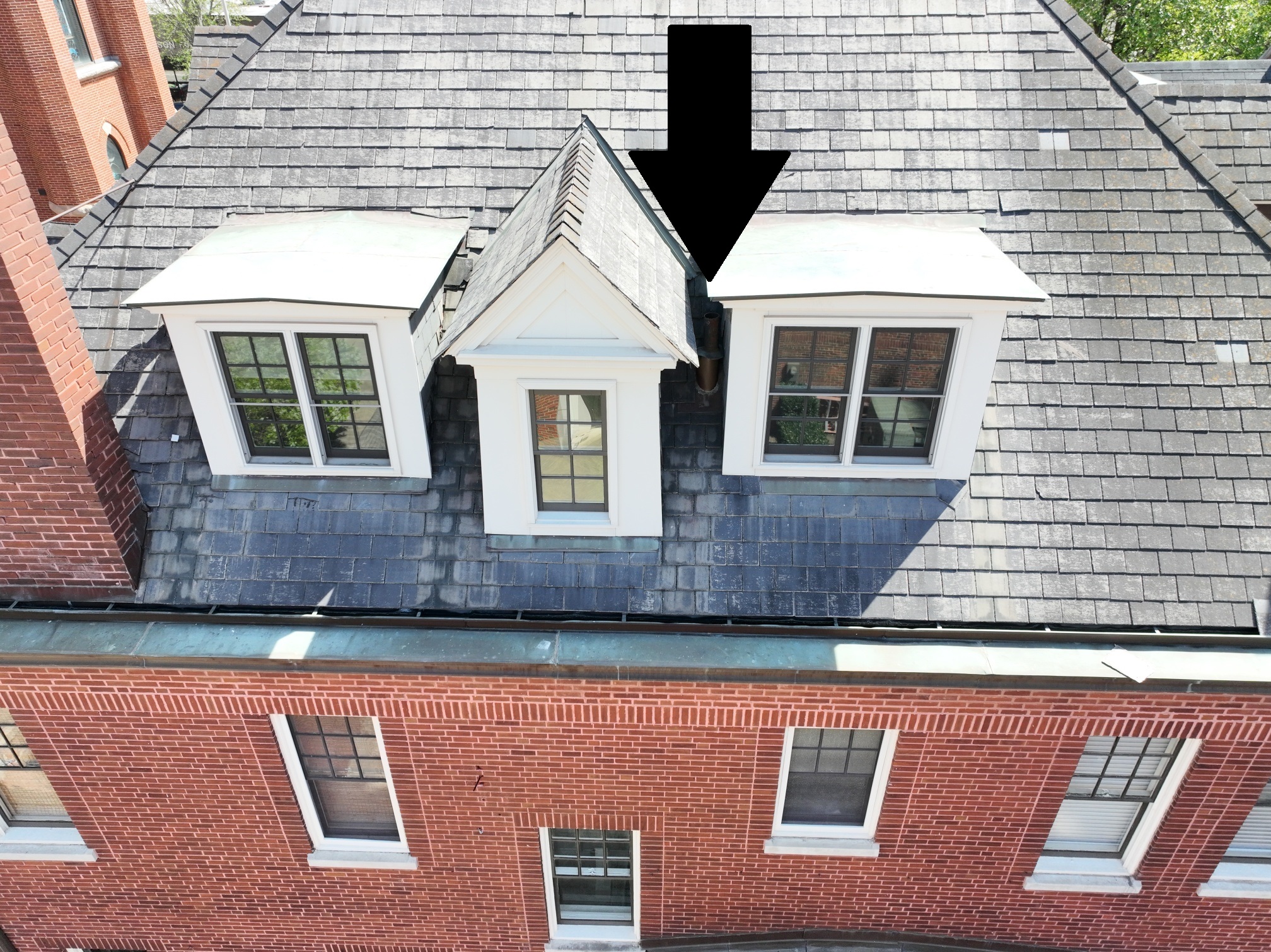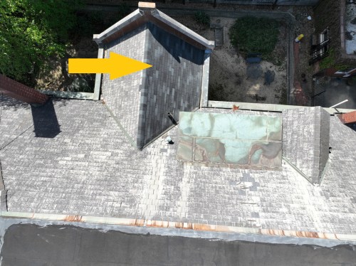 This drone photo gives a general sense of the different roofing surfaces and multiplicity of dormers and protrusions on the Rectory Roof. The four main sides and the two wings are clad with a faux slate product that is disintegrating badly. The top is flat, covered with a tarred membrane which, last year, had a “skim coat” applied to it that would perhaps buy us two more years, to try to mitigate the worst leaks. There is also a sheet metal cover over a former skylight, which rattles during storms and likely lets water in (red arrow). Different dormer styles and some dormers placed very closely together – in several cases, with vent pipes protruding right next to them or between them (see other photos, below) – create a number of water runoff and intrusion issues. The northwest chimney (bottom right – brown arrow) is no longer used and will be demolished. Limestone capping is visible especially on the side wings, front façade, and on the chimneys; there is also such capping along the rooflines of the front and side porches. The side yard (yellow arrow) is where a future driveway exit to Third Avenue North is envisioned; during this project, it will become part of the staging area for the contractor. Please note: an access hatch will be added to the roof to facilitate future maintenance on the flat area (probably where the capped skylight currently is located – red arrow) – the skylight will otherwise be properly and fully removed so that there is no further need for a floppy metal cover to cap it off.