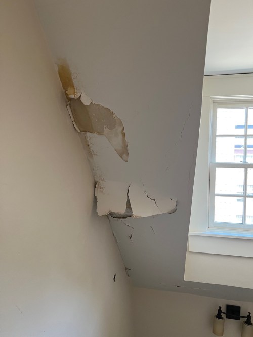 If you zoom in and look closely at the right two dormers (these are on the north side of the house – that is, the driveway side), you can see how a vent pipe is tucked in between them (beneath the black arrow). The dormers are already rather close together, and it is hard to seal the space between them; the pipe being there makes matters worse. A photo below will show the water damage to the ceiling under this area, which is the back staircase. The re-roofing will address issues like this by restructuring the exterior of the dormers and tying them together.