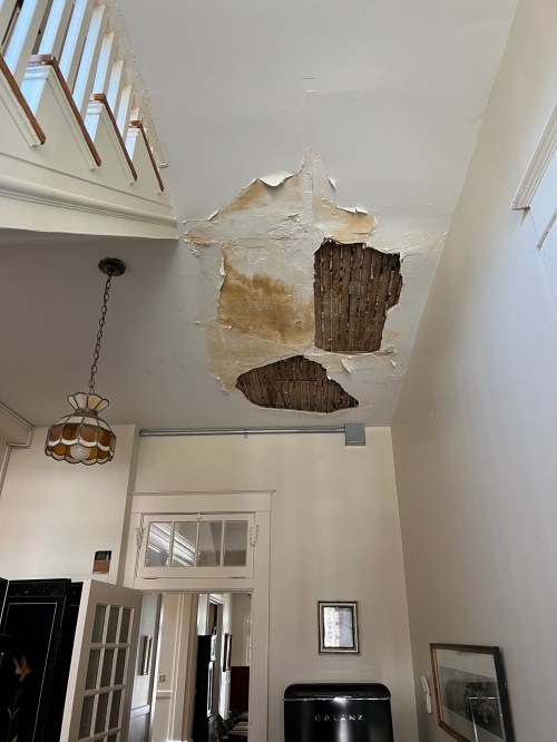 Entering through the back door, one sees the badly-damaged plaster ceiling. Approximately one year ago, an HVAC unit that is in a closet above this area failed, froze, and when it thawed, flooded, filling the ceiling with water. This was partly because that unit was not installed properly to begin with, and the tray at the bottom of it was not wide enough to catch all the water that might drip. The flood also shorted the wiring for the hanging light fixture, which is now scorched and re-wiring is needed. Thankfully, there was not an electrical fire! A drop ceiling will be installed in this area for the time being, rather than spending the much higher amount on plaster repair.