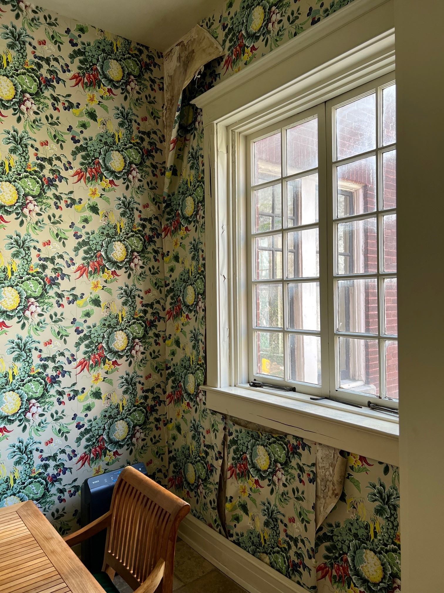 In the “breakfast nook” dining area of the kitchen, which is adjacent to the larger formal dining room and was heavily affected by the water seepage on the west side of the house, the wallpaper is falling off the wall and black mold has grown in behind it. Most of the wall paper on the wall around the window is currently held up by scotch tape. This heavy wallpaper was installed about 20 years ago. One of the 12 HEPA air filtration units that have been placed throughout the house is visible behind the chair in this photo.