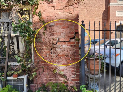There are other issues with the structural integrity of the “Carriage House”, such as very large cracks in the masonry (within the yellow circle) indicative of settling and other disintegration.