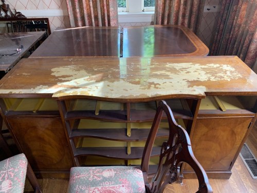 Even though the sideboard of the dining room set was on one side (i.e., not directly under the chandelier), it used to have a glass top on it to protect its top surface, and water got underneath it during the water emergency and cause all the lacquer and stain to peel off. Again, this piece had been in pristine condition for its age.
