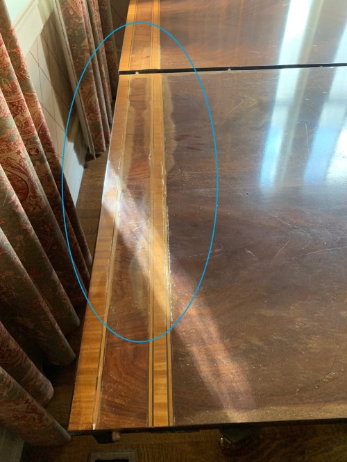 This photo of the dining room table shows a bit of the damage done by the water, which clouded the lacquer finish and got under the enamel, causing it to bubble up (notice this phenomenon especially on either side of the lighter-colored strip of wood inlay – within the blue oval). This was an antique very large table, part of a matching set that fit nicely in this room. It had been in pristine condition before the water emergency.