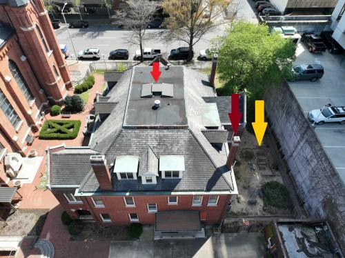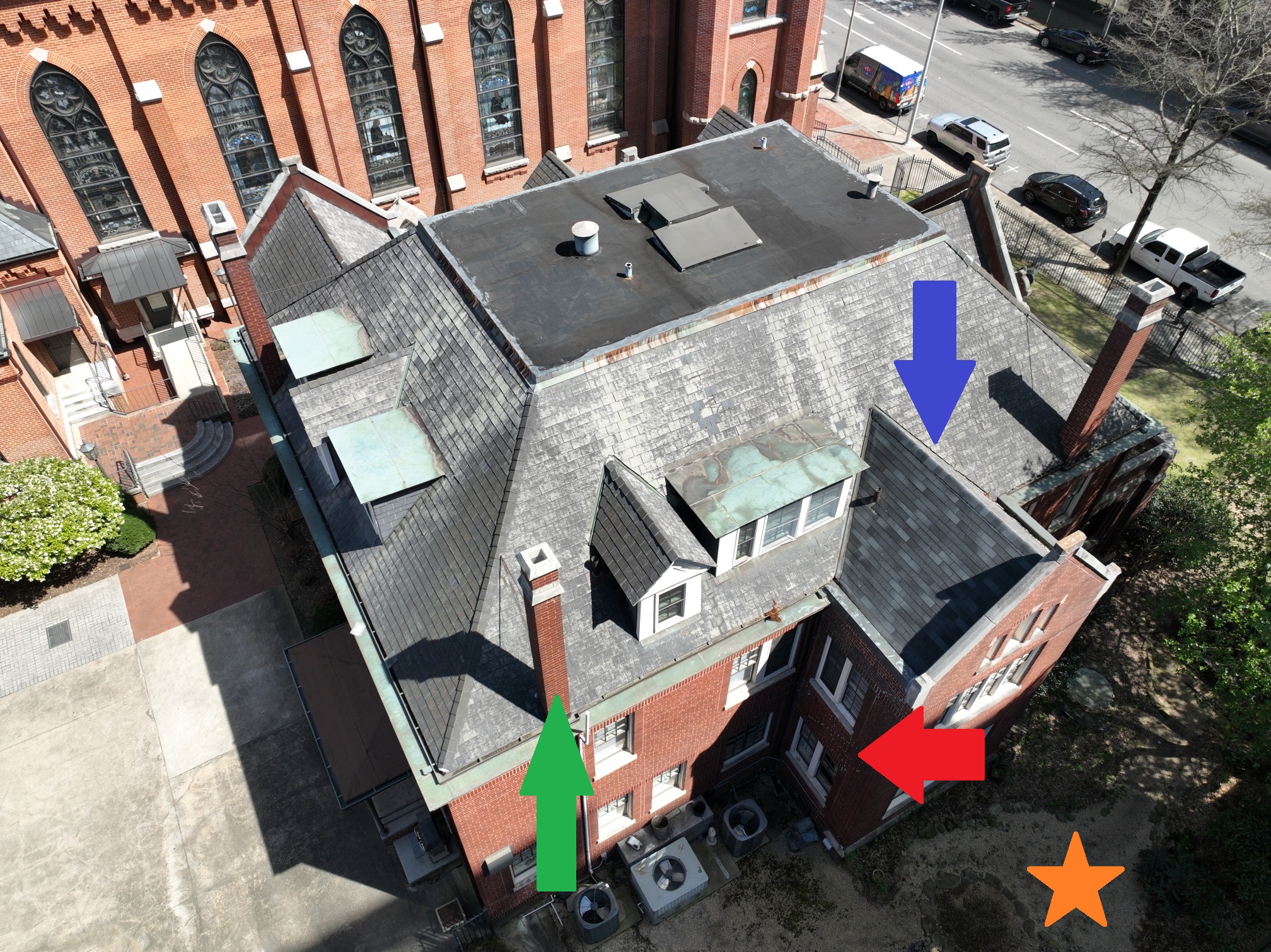 This view from a northwest angle shows in the foreground the long-unused chimney that will be demolished (green arrow), and gives another view of the “west wing” (blue arrow), with its newer asphalt shingles (as described above). If you zoom in, you can see where the brick on that wing was caulked because of the cracking caused by foundation settling and water intrusion (red arrow). Part of Phase 1 of our campaign will include re-pointing of brick in areas like these. The side yard of the rectory (seen bottom-right – orange star) is also partially visible; as noted above, it will become a staging area for the contractor; and, in a future phase, it will become a driveway exit to Third Avenue North.