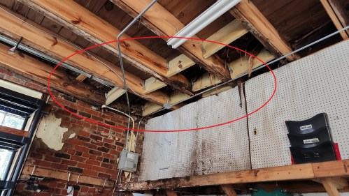 Among the many problems with the “Carriage House” is that the roof is in imminent danger of collapse, due to severe rotting of the ceiling joists (within the red circle). The “sunken” flat roof on this building pools water and causes it to enter inside the building every time it rains.