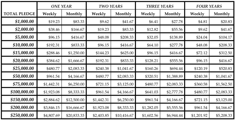 This chart presumes that pledges would be paid at weekly or monthly intervals. This is simply meant to be a guide. Payment terms can vary. Please do not hesitate to reach out to Father Jerabek with any questions or to work out particular details connected with your pledge.