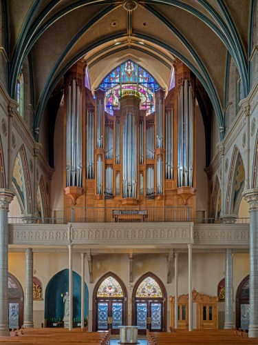 This organ re-integrates a number of pipes from the previous Möller instrument, incorporating them into an eclectic* instrument of French Classical and Symphonic influences well-suited to the Cathedral’s fine acoustic and the strengths of our music apostolate. It is an instrument equally at home in the liturgy and in concert; one that preserves (and enriches) many of the heroic aspects of the Möller instrument while substantially increasing quieter options for accompaniment of singers and choir. The Noack organ’s installation began in the Spring of 2021 and was completed before Christmas 2021. Bishop Steven J. Raica, Bishop of the Diocese of Birmingham in Alabama (by happy coincidence, an organist himself), blessed the new instrument at a solemn Mass for the Solemnity of the Immaculate Conception of the Blessed Virgin Mary on December 8, 2021. Cathedral Choir presented Maurice Duruflé’s Messe cum jubilo along with other pieces; the voluntary was Alexandre Guilmant’s “Finale” from the First Sonata for Organ.